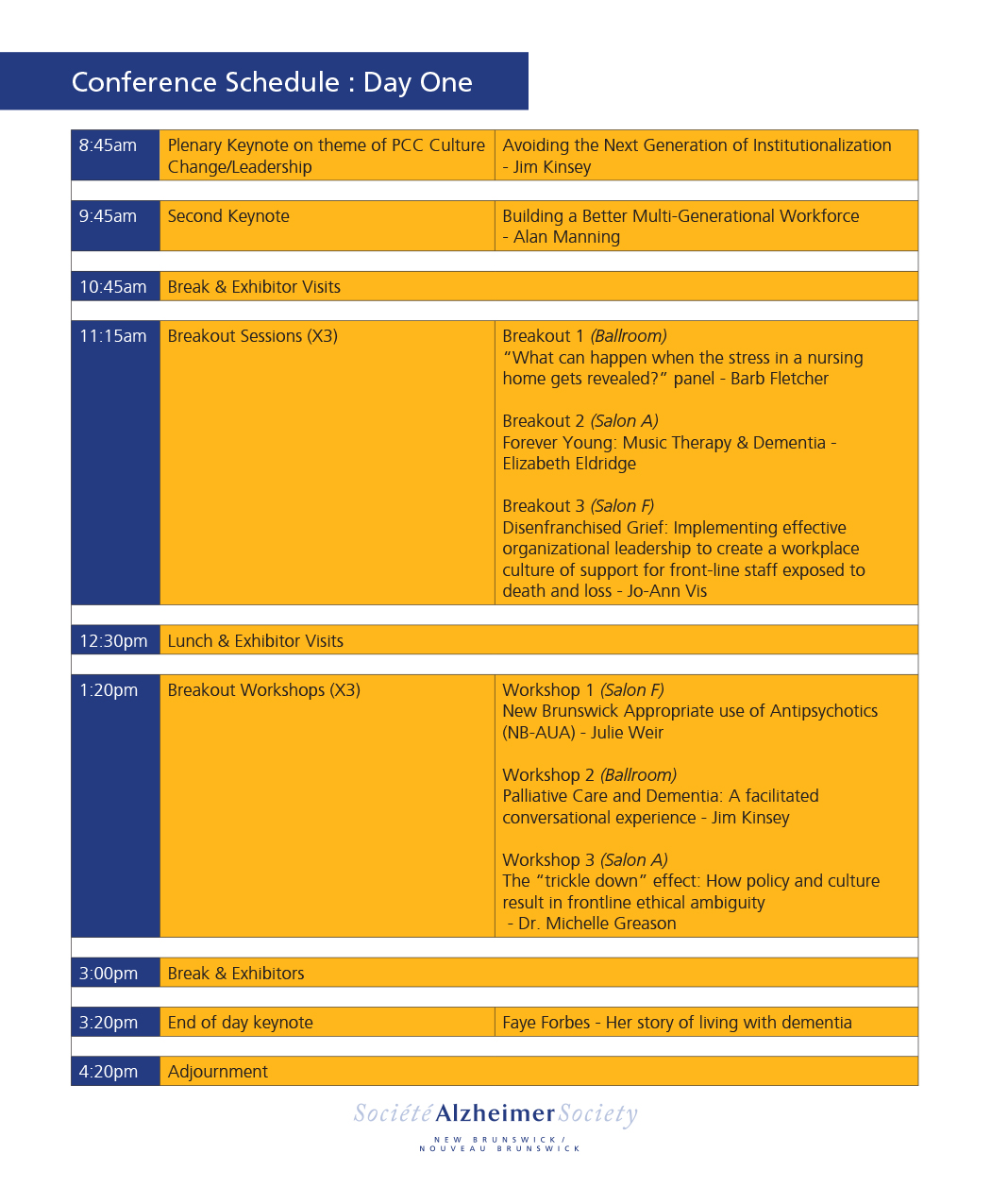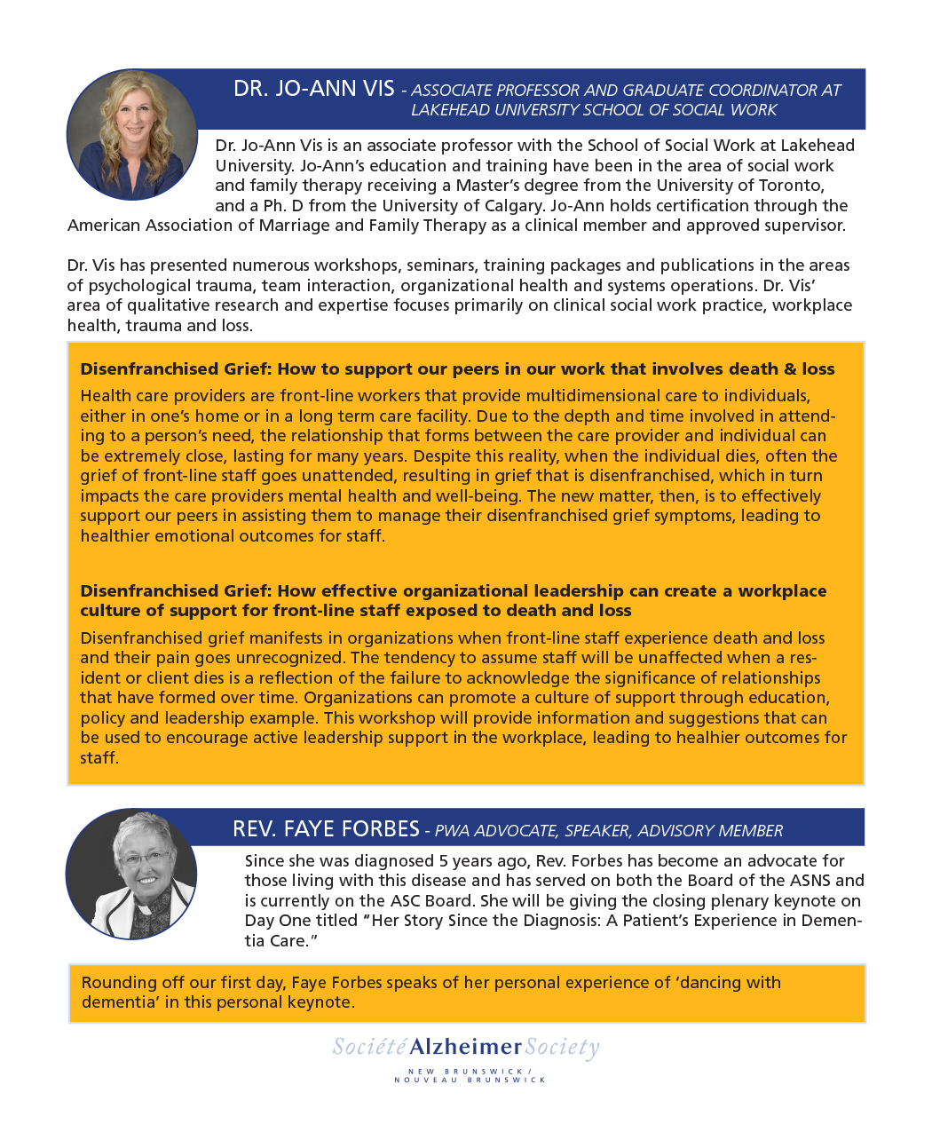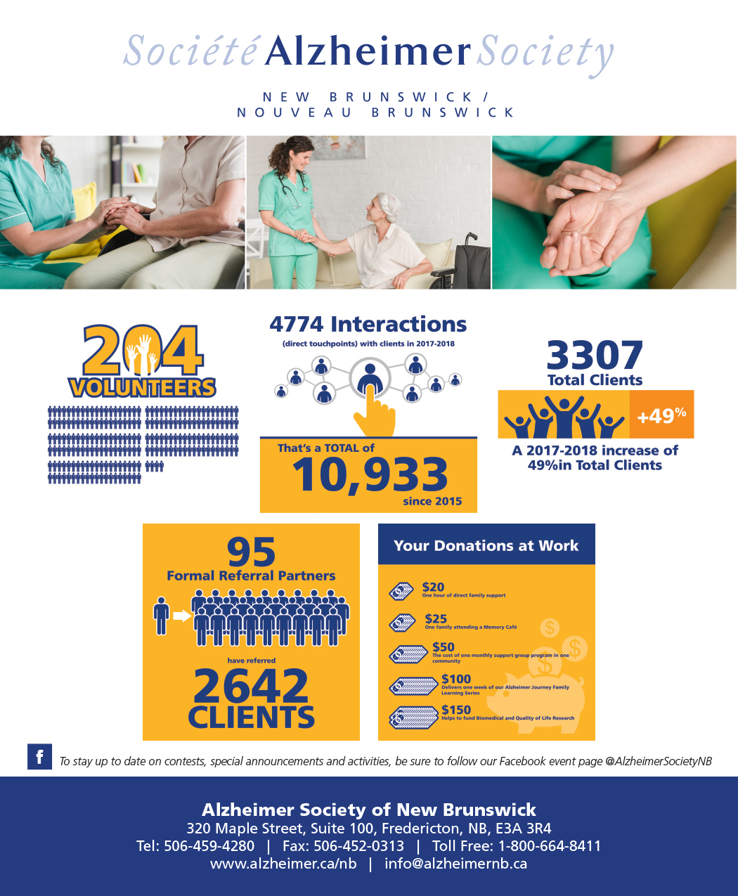 The Alzheimer Society of New Brunswick is a not-profit health organization whose mission is to alleviate the personal and social consequences of Alzheimer’s and other dementias, through information, education and support, and to promote public awareness.